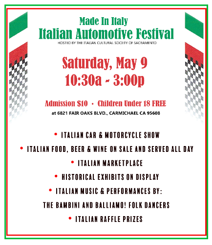 Do you have an Italian car, motorcycle, motor scooter or bicycle you would like to show at the Festival please contact Vincenzo Cerruti at: sacramento.italian.society@gmail.com or call 510-737-1434.